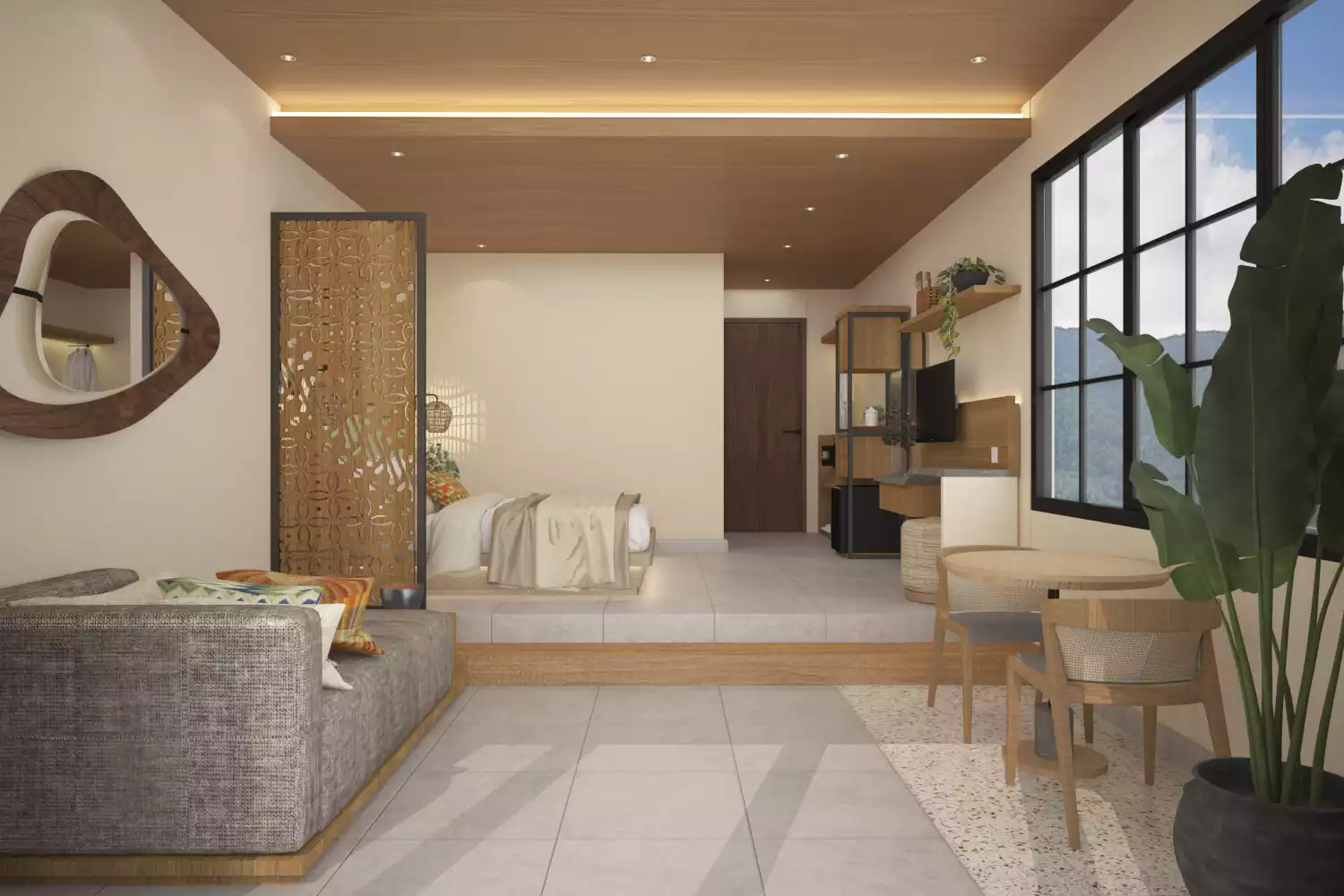 Spacious queen room with direct garden view, perfect for a calm and cozy stay.